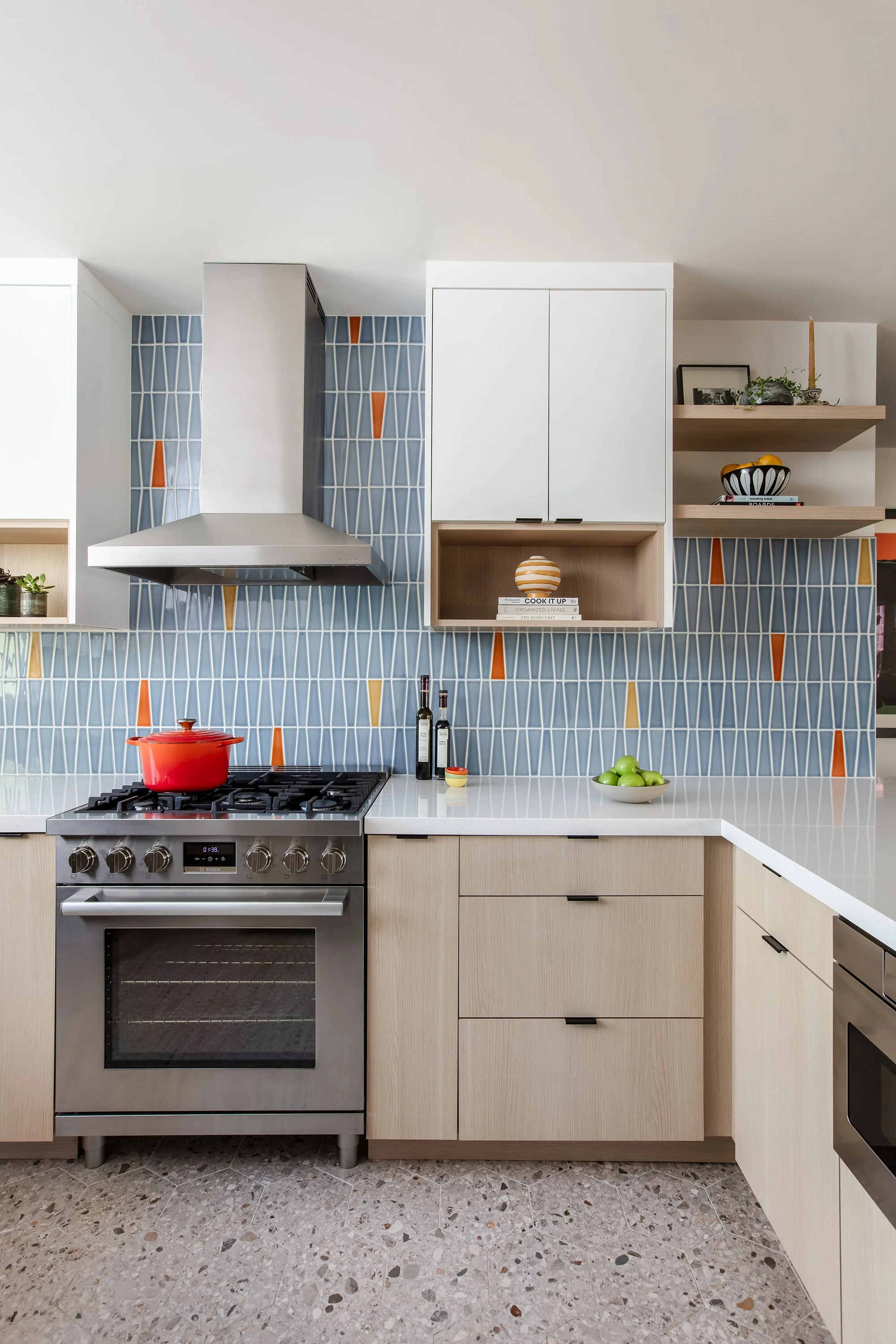 In a kitchen, try an angular backsplash paired with iconic sputnik lighting to create a fun and playful juxtaposition in your space