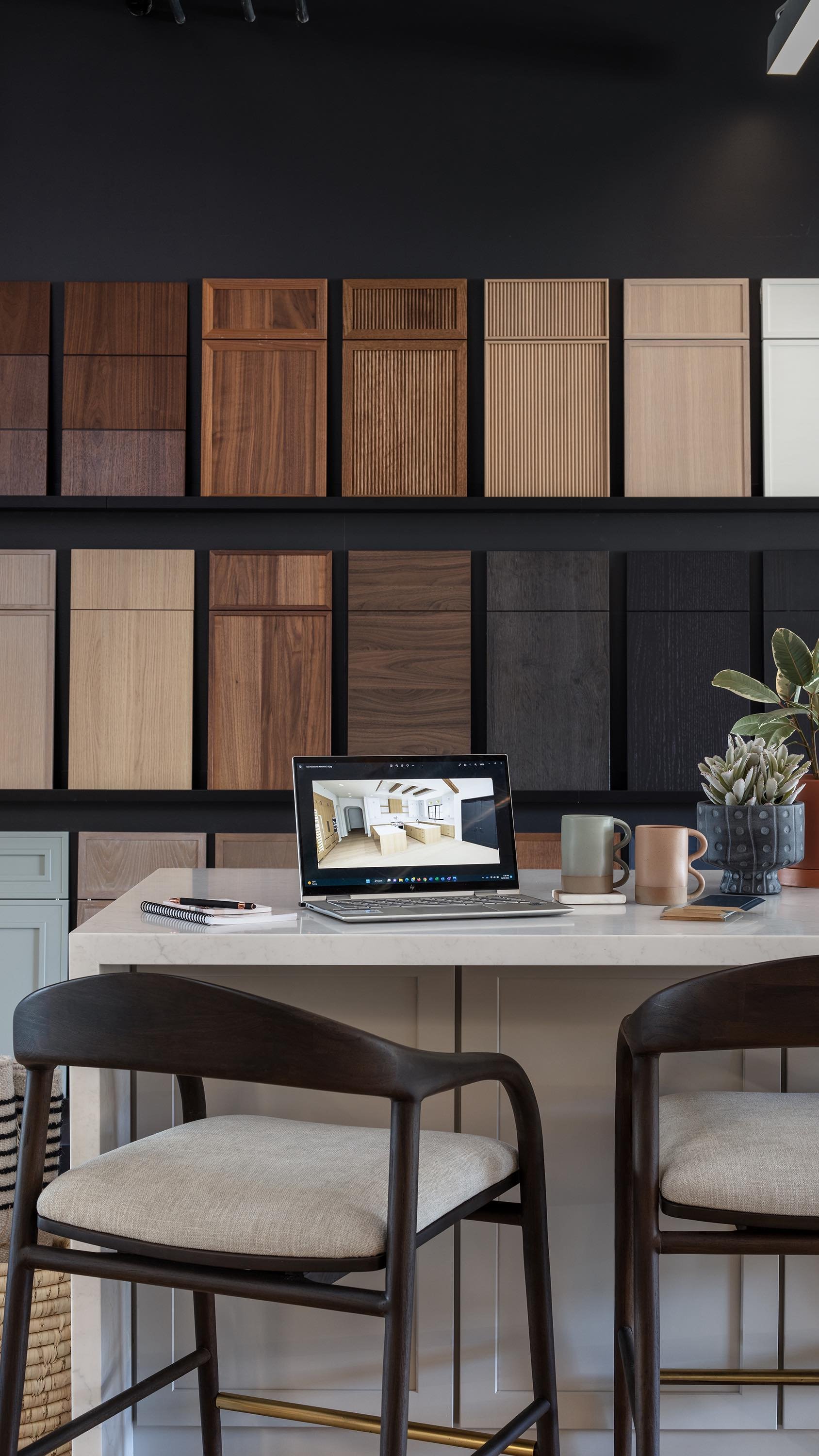 A bold statment floor, natural wood tones and an earth-toned color palette blend beautifully to create a modern guest bathroom that feels energized, playful and spa-like.